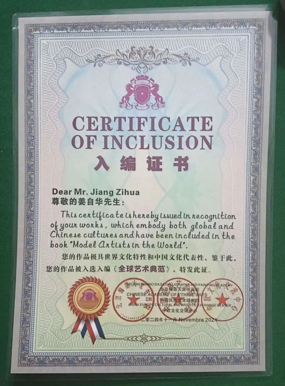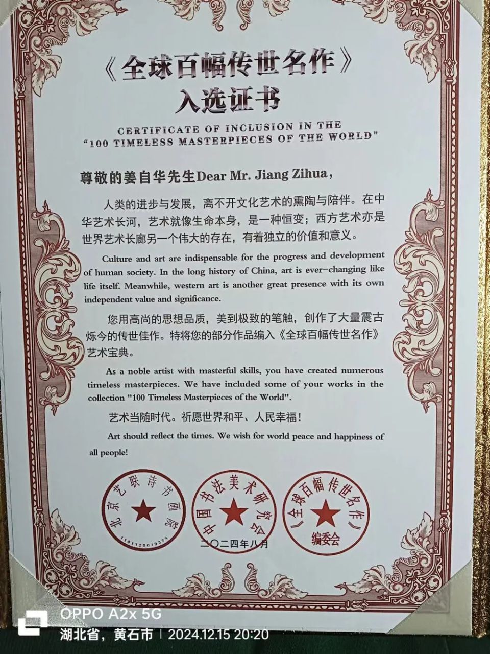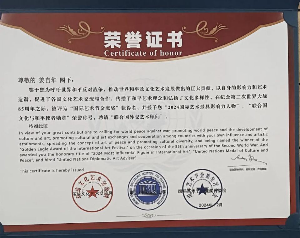 2024年12月19日,一个刻骨铭心的日子。此时此刻双手颤抖激动不已,高举国际艺术节金鹰奖,联合国文化与和平使者勋章,2024国际最具影响力人物奖及联合国外交艺术顾问聘书,百感交集泪如雨下,文化的太阳照亮了我的文学梦。